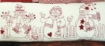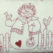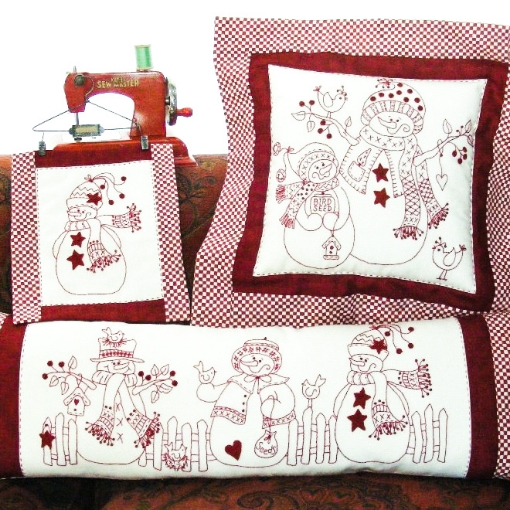 A happy group of smiling Snow People stitched in cheerful RedWork using #1915 Robin Red Perle cotton. Stitch up these characters to warm all the chilly days of winter - not just for Christmas! Add sparkling red glass beads instead of tricky French Knots coupled with wool applique dots, stars and hearts. They add lots of texture and fun to your designs.Make a long pillow or use it as a draft dodger to foil the cold winds coming under your door. The large square pillow will make quite a statement on your favorite chair or on the couch. Each one of the Snow People can be stitched individually too and made into small pillows or wall hangings. Stitch with the Perle cotton on muslin and finish with your favorite red and white print and a turkey red solid.