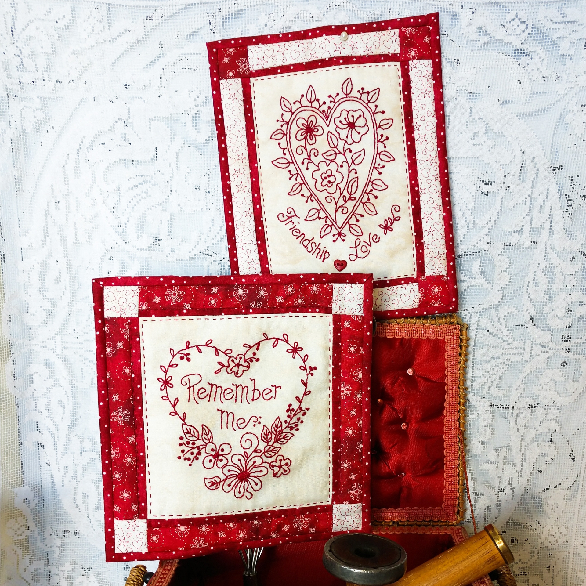 Lovely Floral Hearts to Remember Family and Friends. Delicate flowers stitched in Heart shapes make these designs perfect for “Everyday Valentines”! RedWork flowers plus the embroidered mottos are a wonderful Gift Handmade with Love. Enjoy the Creating and the Giving!