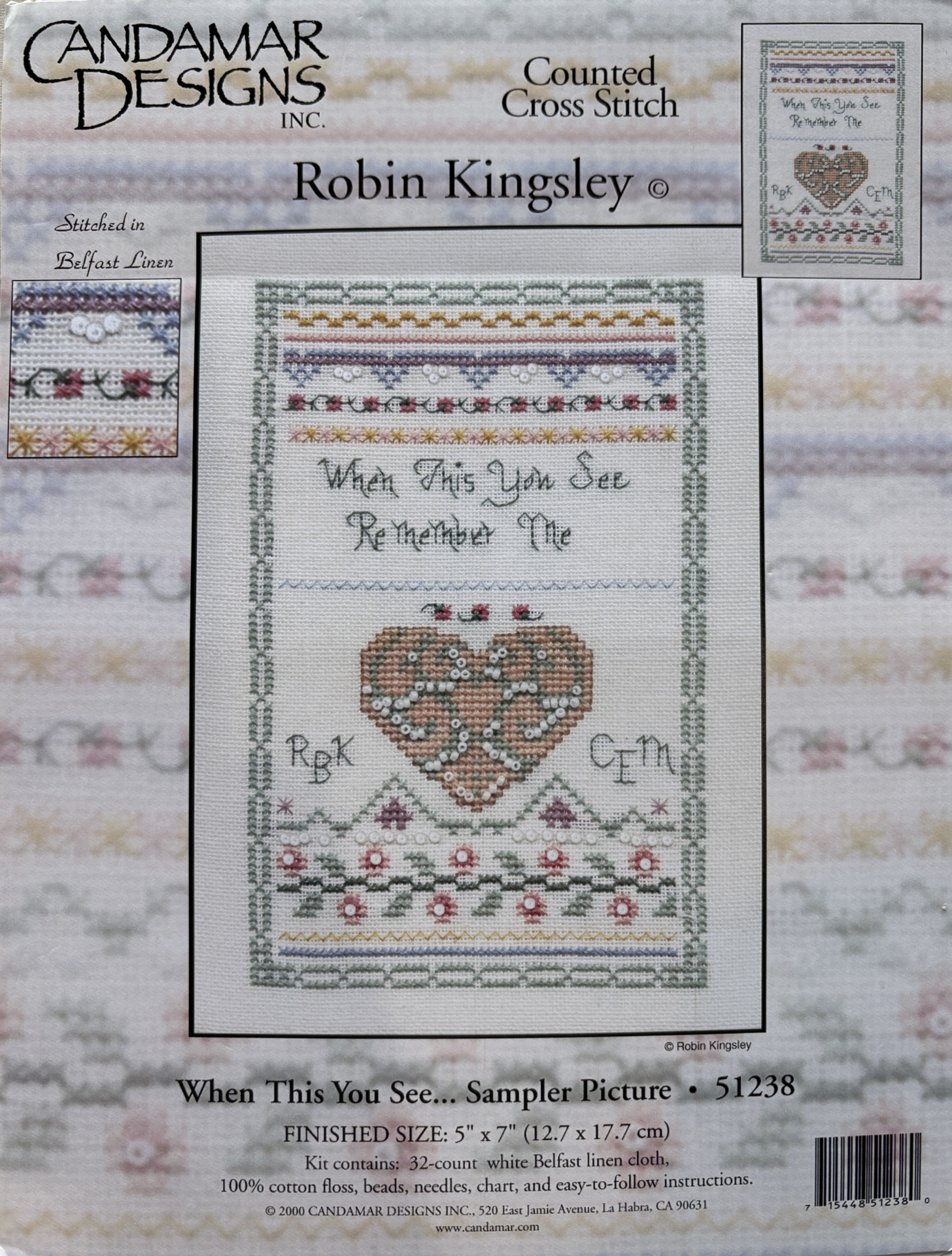 Cross Stitch a Lovely Sampler with a Large Heart and a Sweet Saying, "When This You See, Remember Me." Add Clear Crystal Beads for Additional Sparkle. Stitched on 32 Count Cream Belfast Linen Cloth.