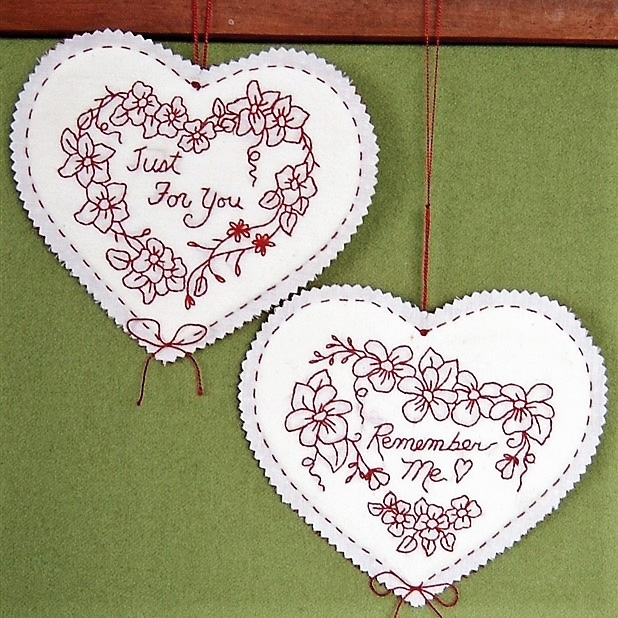 A pair of sentimental RedWork hearts to make for your best friends or for you family. Stitch in RedWork Embroidery using #1915 Robin Red #8 Perle cotton or 3-ply embroidery floss.Trace your heart designs directly onto the muslin with a FriXion pen.If you DO NO like to trace, use Stick 'n Stitch. Print your heart designs on the Stick 'n Stitch with your printer. Pull the printed designs off the paper backing and finger press onto your muslin. Add your hoop and get stitching in just minutes - super stuff!Finish your hearts as ornaments or as a sweet sachet stuffed with lavender buds!Finished Sizes: