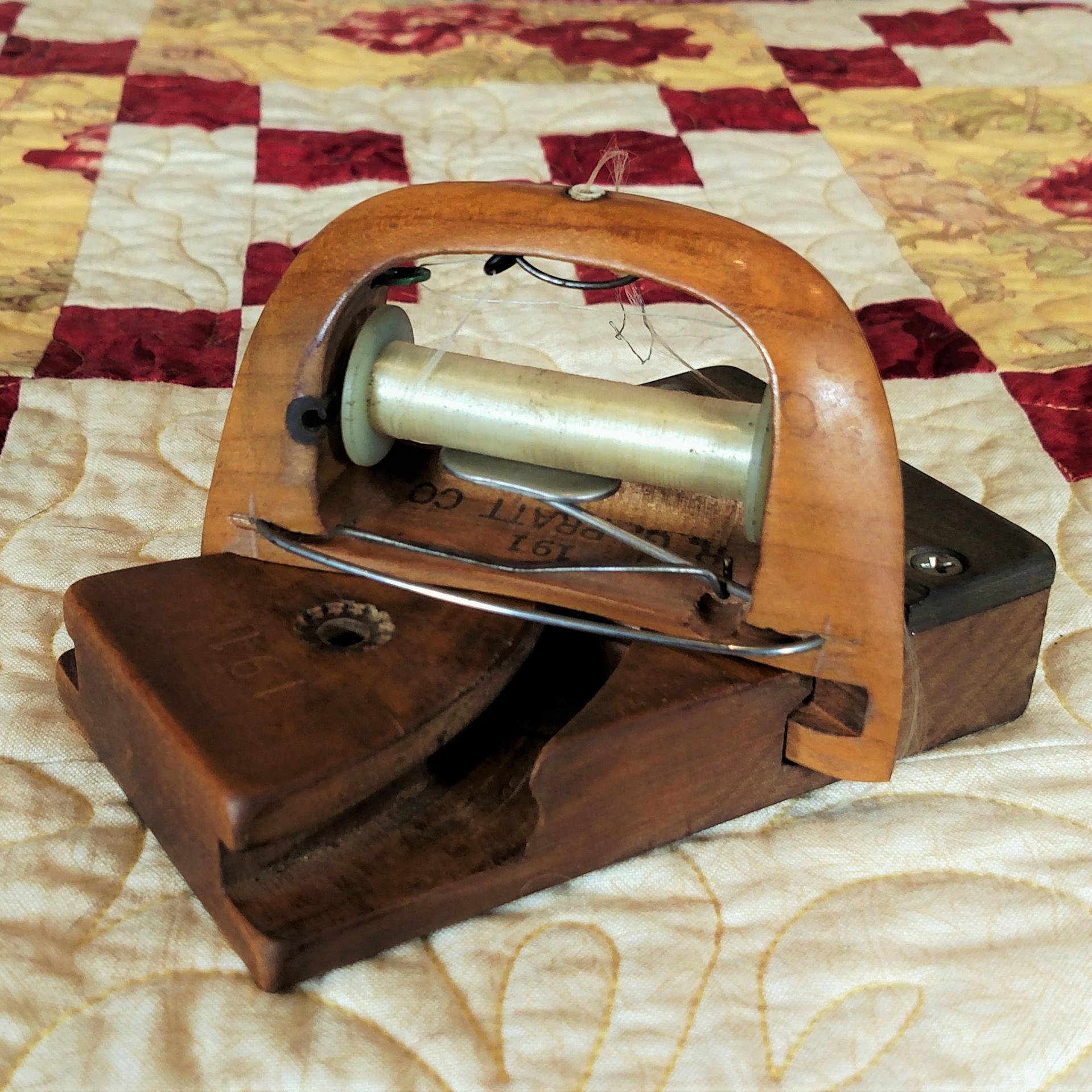 A small curved shaped shuttle including the base used to weave ribbon. Our interesting petite shuttle is a lovely vintage Needlework treasure to decorate your sewing room. The wooden base has the "gears' that moved shuttle with a bobbin of thread. Also included is a bobbin filled with different thread colors. Each marked "R. G. Pratt Company".