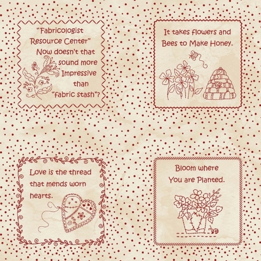 Panel of 16 Silly, Stitchy, FUN sewing sayings - called Robin-isms! 4" blocks to make LOTS of great stuff.....quilts, pin cushions, mug mats, ornaments....start thinking! Each panel has ALL 16 sayings.