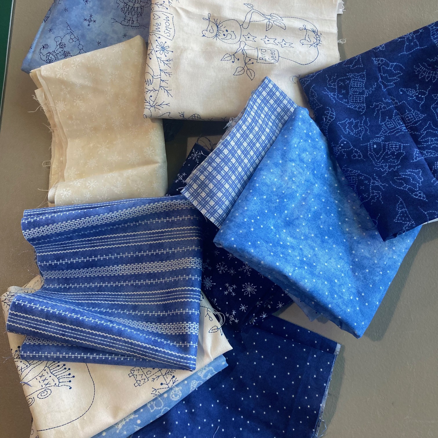 10 Ounce Surprise Scrap Bag of Roly-Roly Snowmen, Snow Happens, and Basic Bluework fabrics.