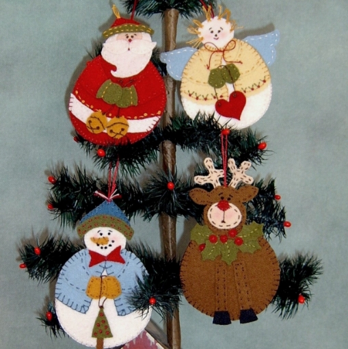 Four chubby and cute Wool Applique holiday ornaments perfect for your tree or to tie on a package for someone special!Easy to do applique with beautiful wool fabric. Merry Christmas!