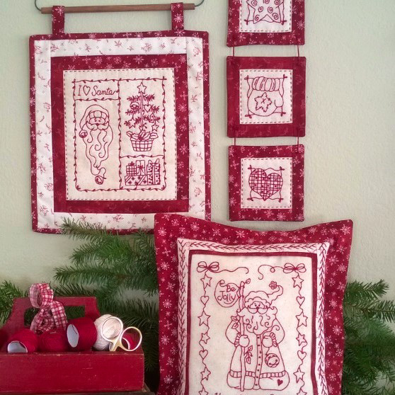 Sweet Santa is coming to celebrate Christmas at your home. Make RedWork Quilted Wall Hangings, Pillows & Ornaments with added decorative stitching. Make some Welcome Gifts!