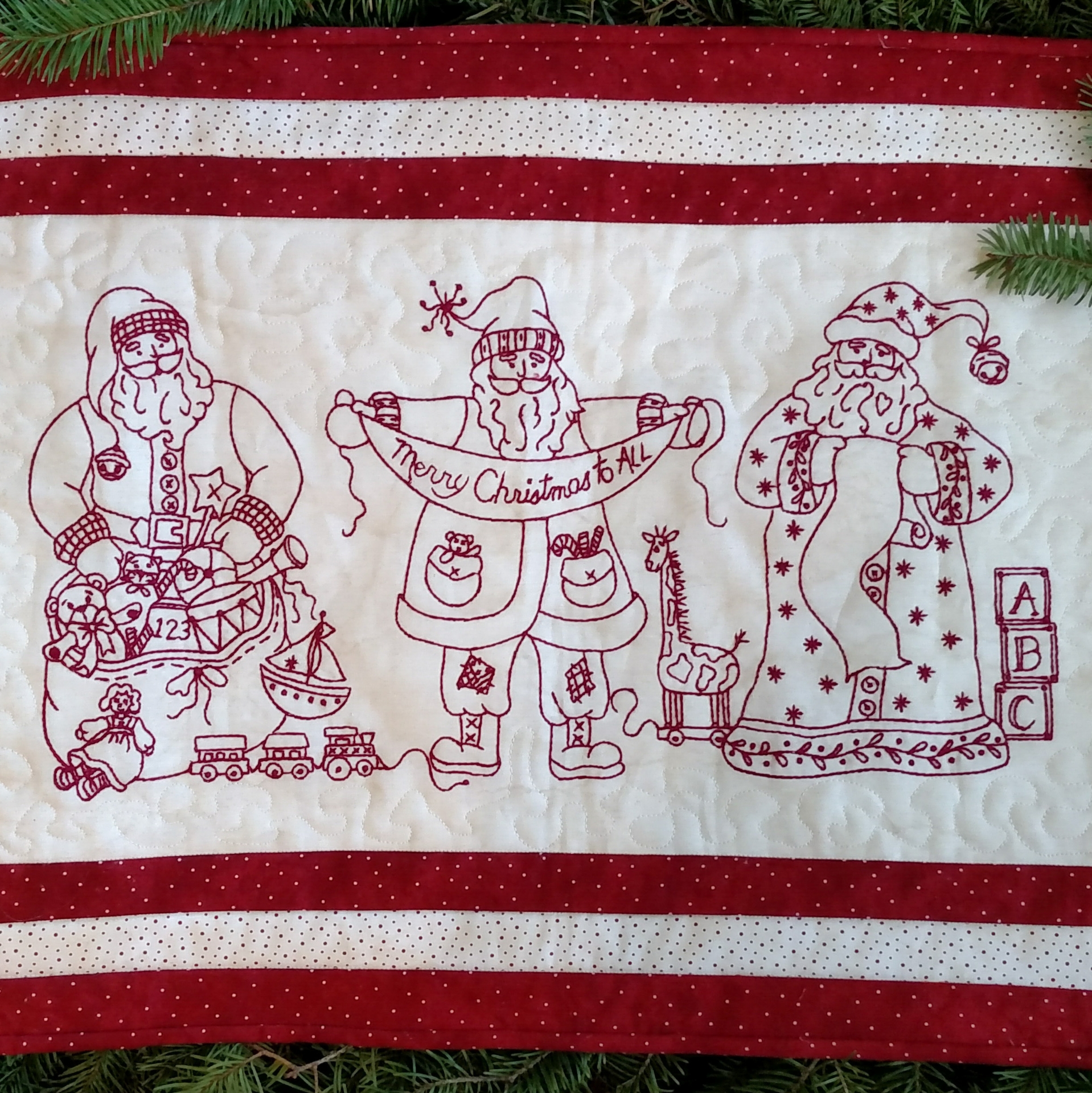 Three portraits of our favorite, Santa Claus. Each FUN RedWork Machine Embroidery shows him in a different holiday costume. Add a EASY-to-FINISH border on the 3 Santas creating a super Table Topper or Frame all 3 together. Merry Christmas!