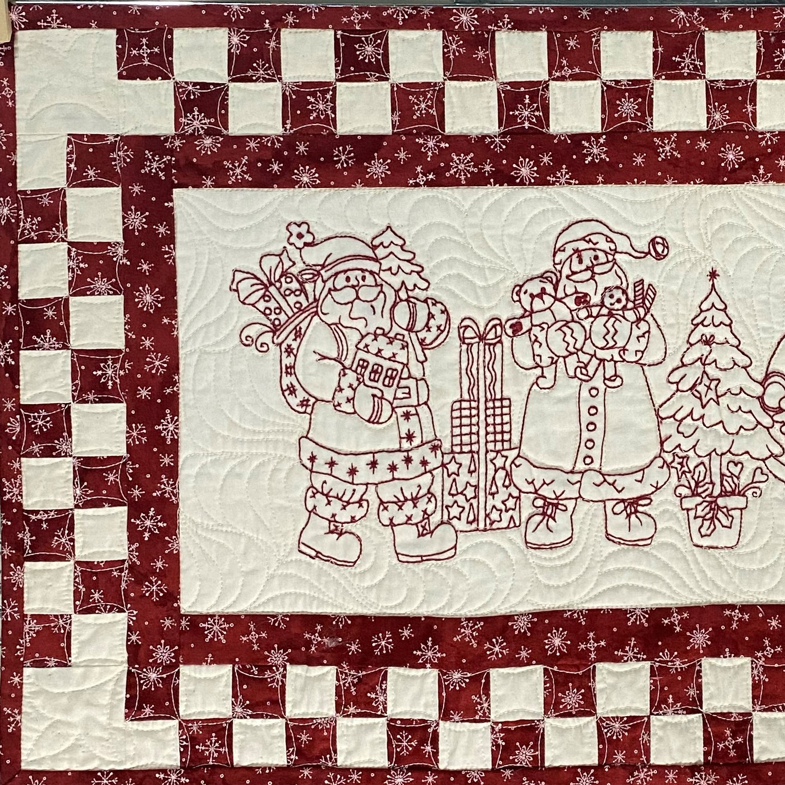 Four views of Santa Claus in a Variety of outfits from His Suit Collection! All 4 Santas in different suits plus the other Christmas Goodies make a Terrific Holiday Table Decoration. Embroidered in Red on a pale tonal cotton. The Table Runner is finished with a dramatic Red and Cream Checkerboard Border. Custom Quilting adds a classy finish and interest to the finished Table Runner design.