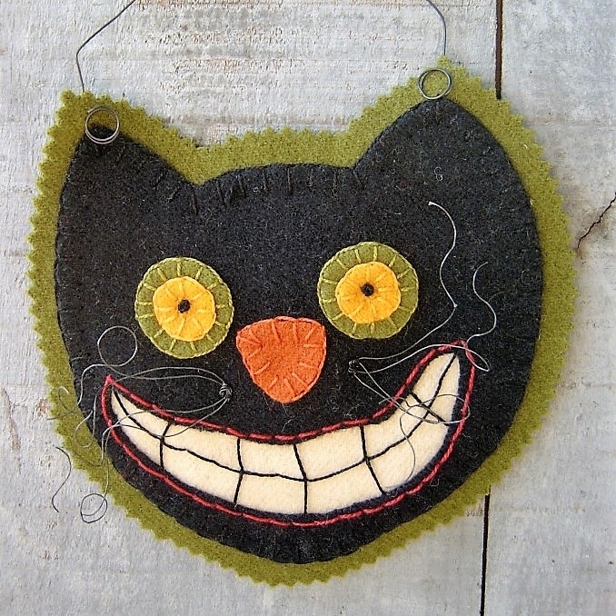 A funny little Wool Appliqued Halloween cat face to make and "hang around" the house for the holiday. The applique is fun and very easy to do attaching the wool pieces with #8 Perle cotton. Cut out the big grin and place wool behind for a reverse applique look. Give this little Scaredy Cat a try!