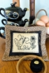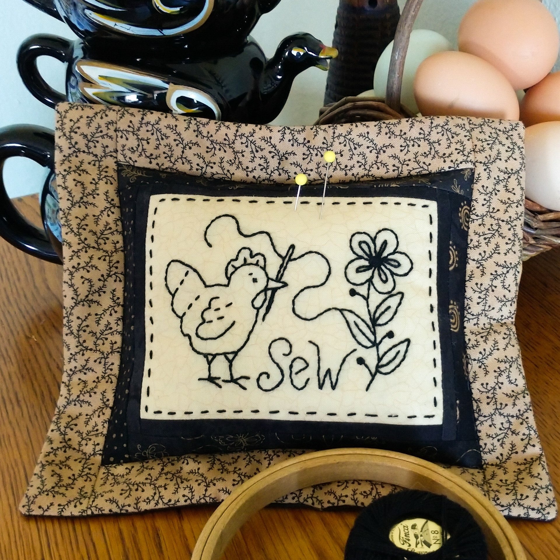 Our “stitching” Hen is sewing her own flower for her Chicken Yard in bold BlackWork and finished with Black and shades of Tan Cottons.