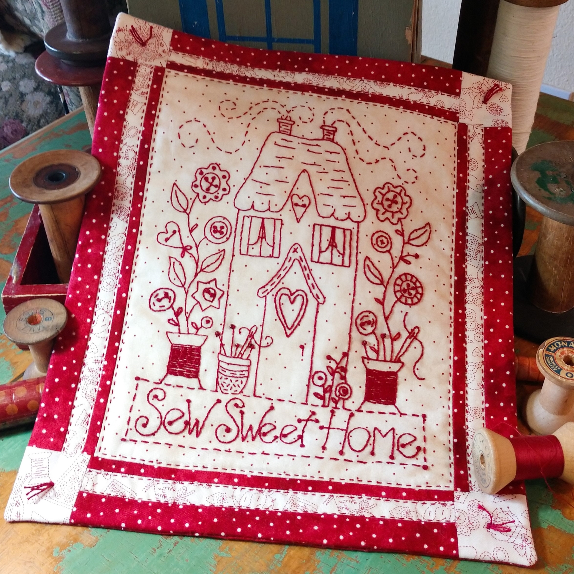 A Petite Stitcher’s Cottage. Clever garden planters and whimsical flowers add to the creativity of this sweet little house for Stitchers. Embroider on cotton with tiny scattered red dots on a creamy tonal background adding more interest to your design.