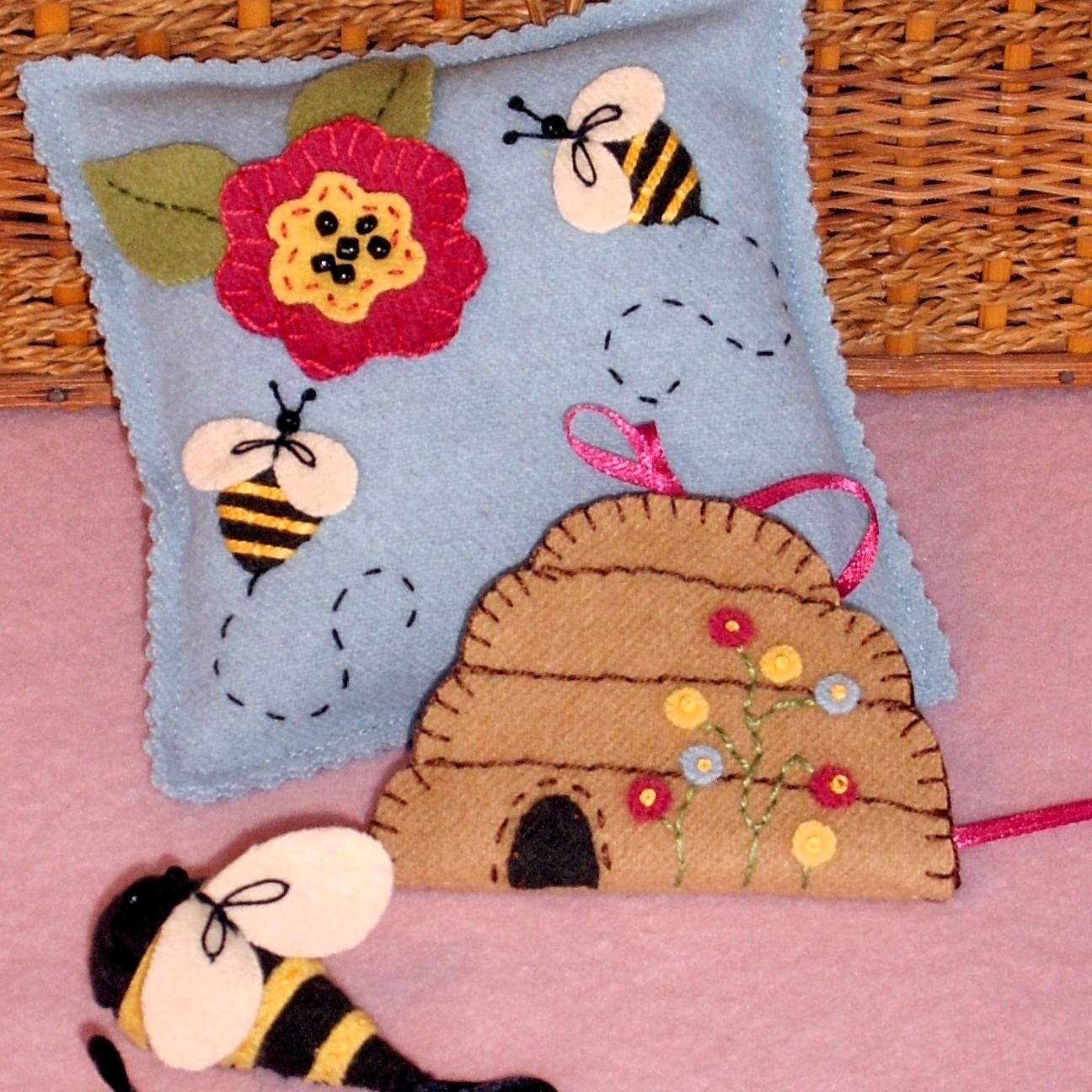 A fun trio of Wool Appliqued stitching accessories with great personality. The little bee is filled with Emery to sharpen all your pins and needles while keeping track of your scissors! Make up a set for yourself and all your stitching "bee" buddies!Handy Hint: thread a needle with each of the Perle cotton colors to speed along your applique.