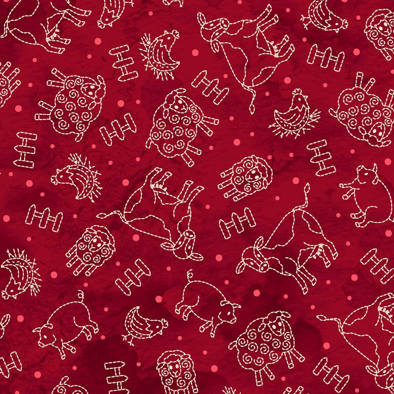 FUN fabric with lots of farm animals tossed among barnyard fences. Great for Farm-style quilts and embroidery designs. Choose red on cream or cream on red....lovely rich shades of Red!