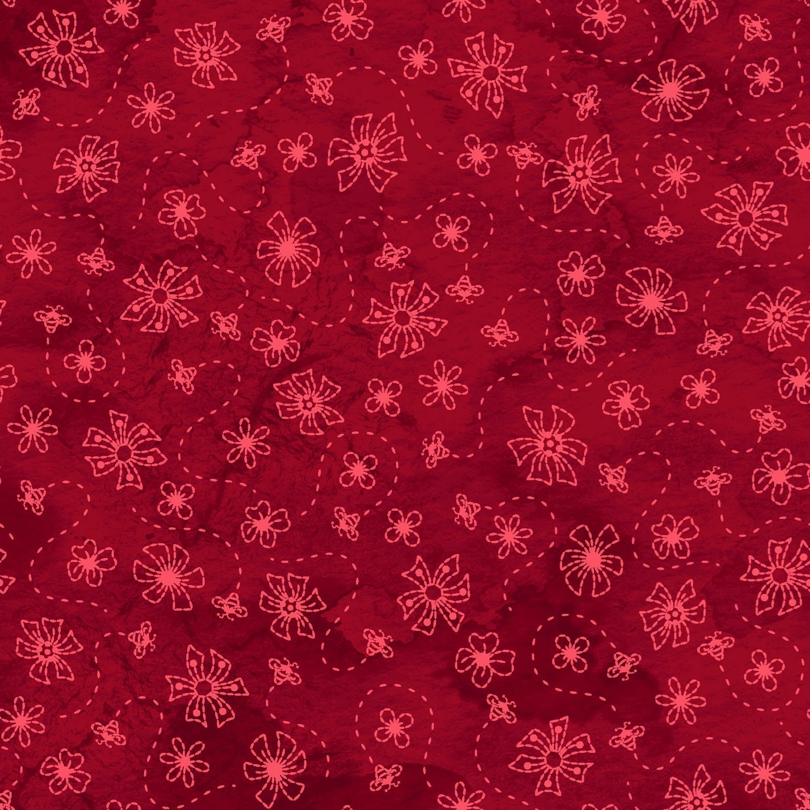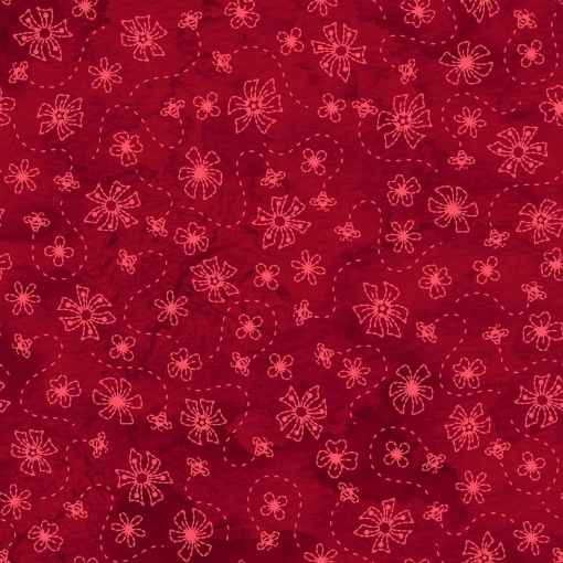 Floral fabric with scattered small Blossoms and flying Bees ALL with a Back Stitched appearance. Great accent fabric for quilts and embroidery designs. Choose Coral-Pink on Red or Cream on Red....lovely rich shades of Red!