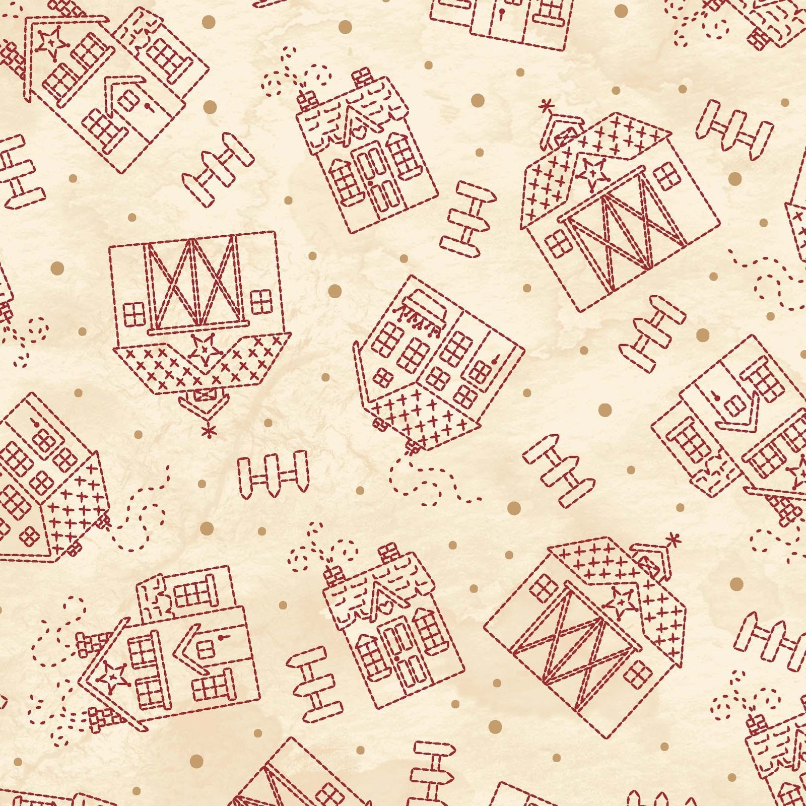 FUN fabrics with lots of Houses and Barns tossed among picket fences. Great for Farm-style quilts and embroidery designs. Choose red on Light Tan or cream on red....lovely rich shades of Red!