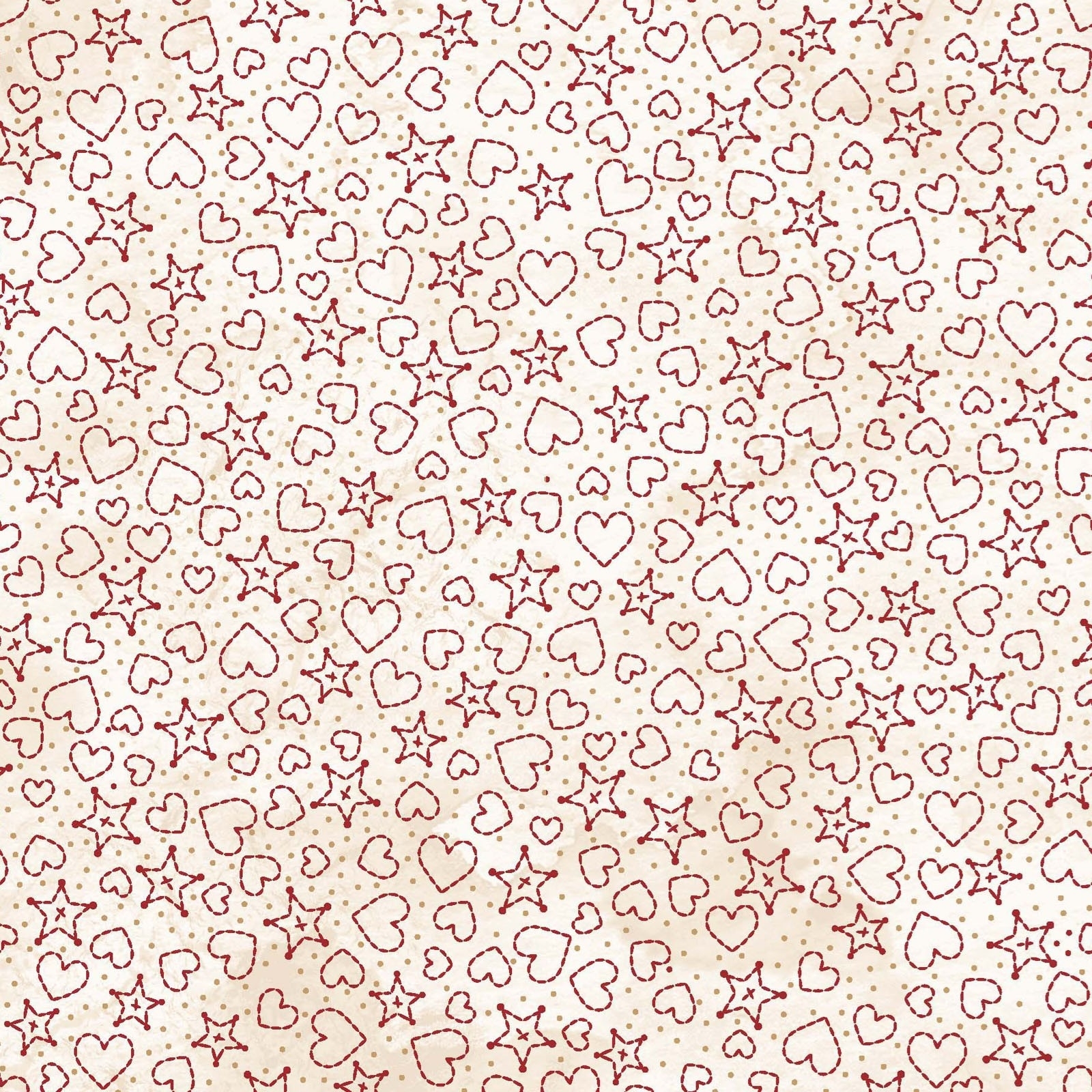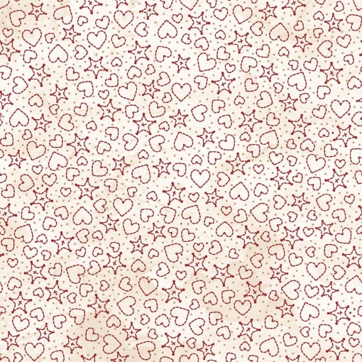 A sweet fabric with delicate Red Stars and Hearts with tiny Tan Dots on a light tonal Cream background creating an overall print. Perfect small motif print to use on Quilts and Embroidery. Choose Red on Cream or Cream on Red!