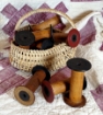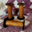 A beautiful petite bobbin used for Silk Thread. One end is marked Cull Silk Mills. Inc. The wooden shaft has a wonderful rich color and each bobbin shows the scratches from the knife used to remove the remnants of Silk thread before winding more thread on the bobbin.....you can tell they are authentic! The ends are a composite (phenolic) material. Winde some of your special ribbons and lace on the bobbins!