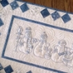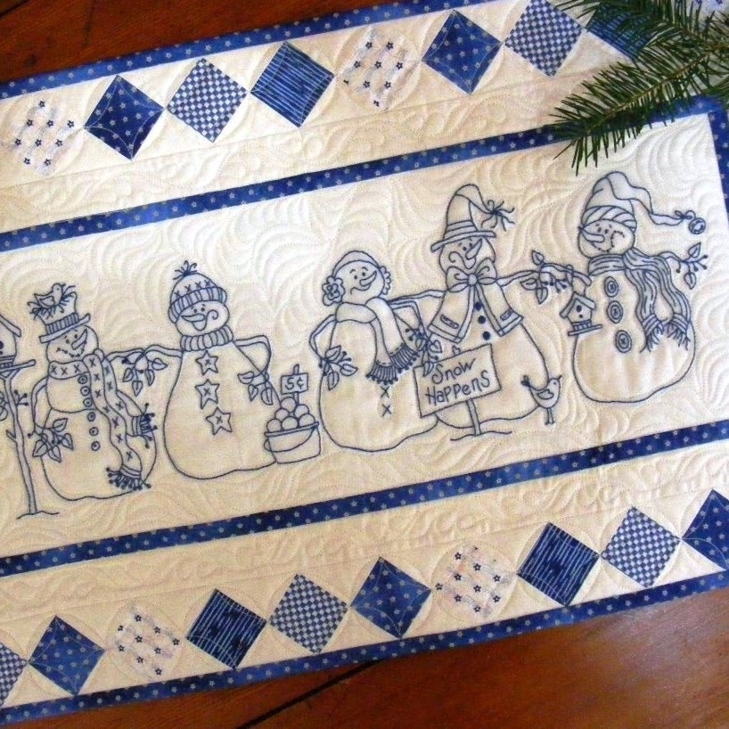 A Line-Up of 5 Smiling Snowmen Pose as They Wait for the Snow to Fly! A Fun BlueWork Table Runner to Decorate Your Home for the Holidays and ALL Throughout Winter. Machine Embroider in BlueWork or RedWork on crisp delicately tonal "Aged to Perfection" Feather Down. Finish with coordinating Blue or Red Snow Happens Cotton fabrics in a fun square on point designs for a wonderful winter table cover. These snowmen will be wonderful in Cheerful RedWork too!