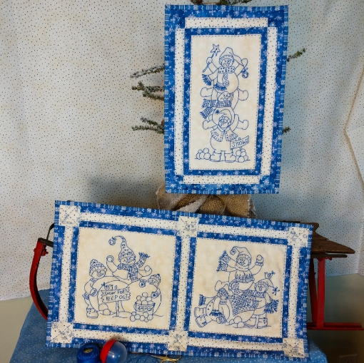 3 BlueWork Designs showing off a super Winter Sport - A snowball fight! Fat Roly-Poly Snowmen frolic in the snow enjoying LOTS of snow having LOTS of Fun. Invite them into your house for fun during the Winter or to make you smile any time of year.