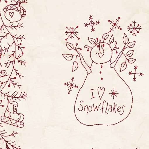 Use these FUN Snowmen surrounded with "Pine Garland" loaded with lots of cute little motifs that will coordinate with the other Fabics in the Snow Happens Collection. Red Snowmen on Gently Aged Cozy "Aged to Perfection" Background. Fussy cut the several Snowmen and Garland or use as a Whole Cloth Panel plus border settings using other Snow Happens Fabrics.