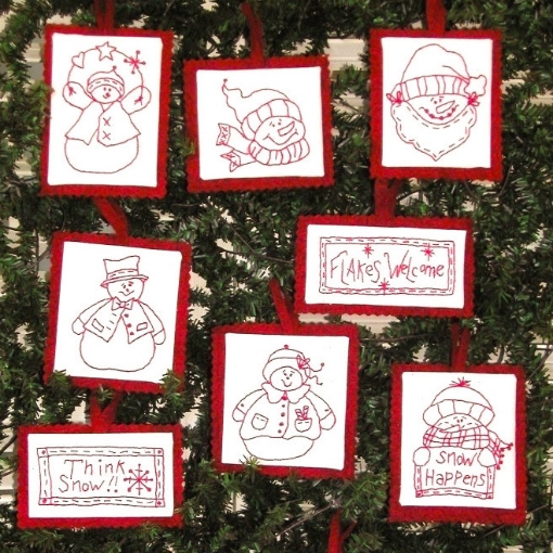 A cheerful gang of Machine Embroidery RedWork snowmen ornaments to add to your Christmas tree, decorate a wreath or tie an ornament on a special gift package!