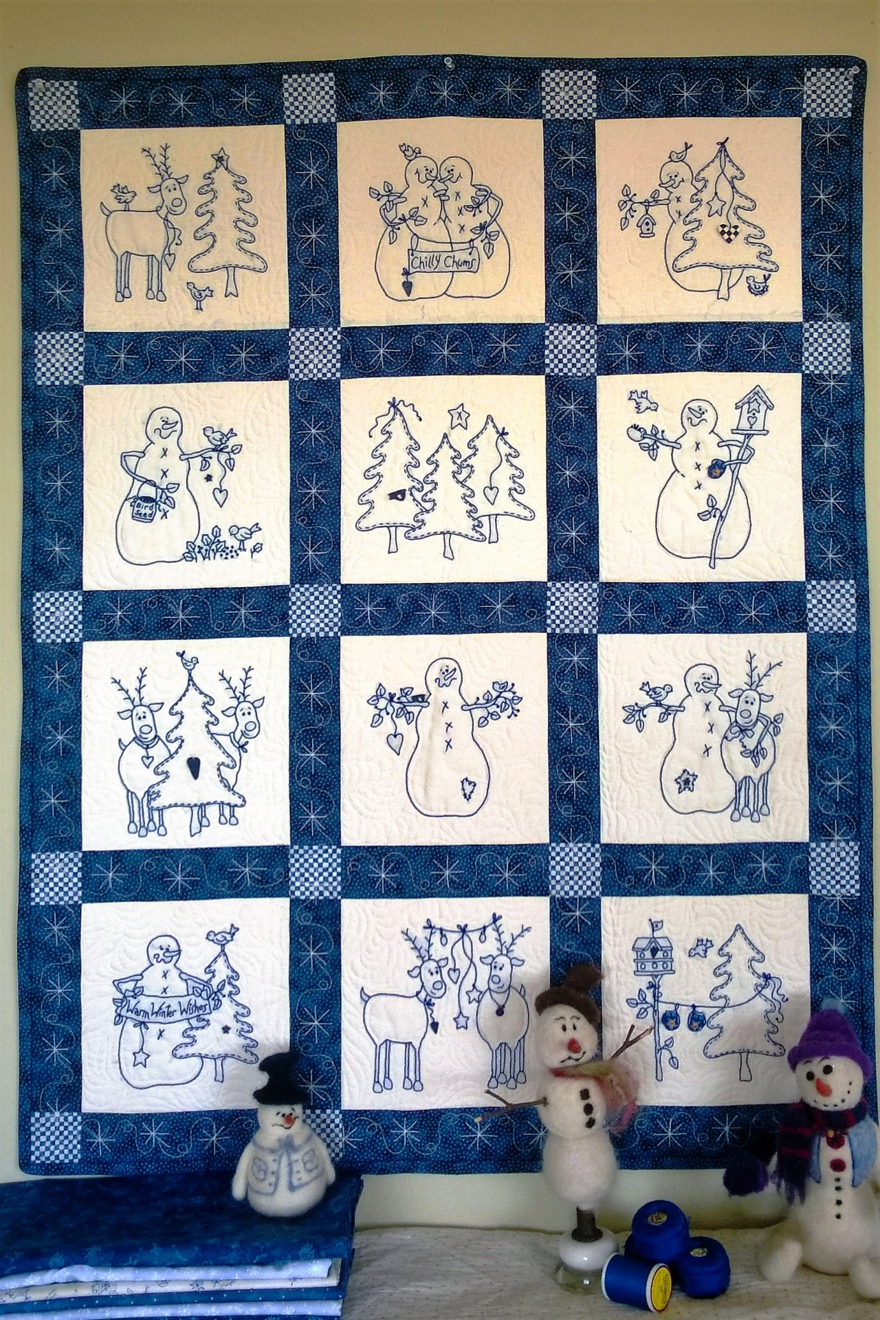 Embroidery Blocks: 1.5 yards of muslin1/4 yard Blue/Navy Checkerboard1 yard Blue Scattered Dots for Sashing and Binding.