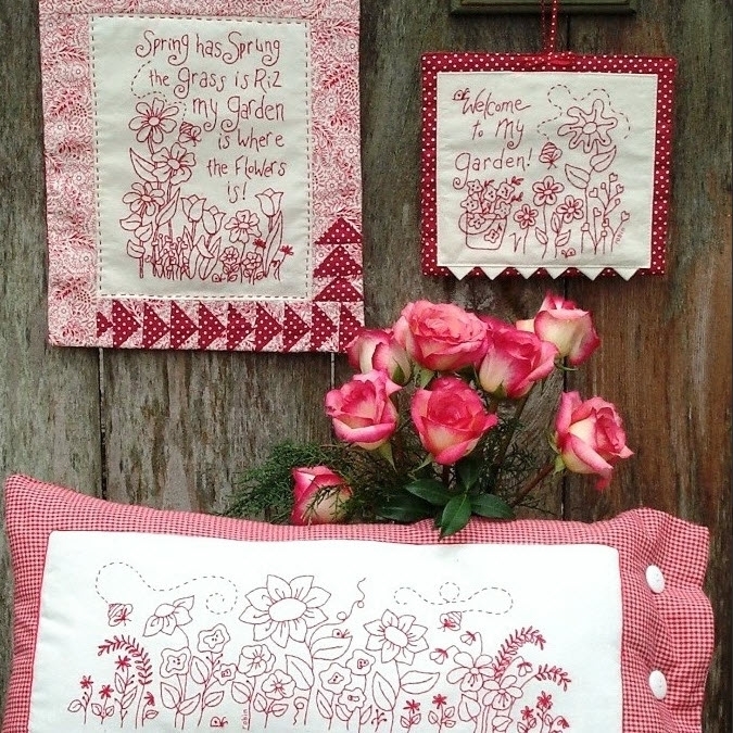 This RedWork pattern includes a pillow, wall hanging, door knob welcome sign and a pair of book marks to tuck into your favorite garden guide.RedWork is quick and easy to do and a relaxing way to create spring any time of year!