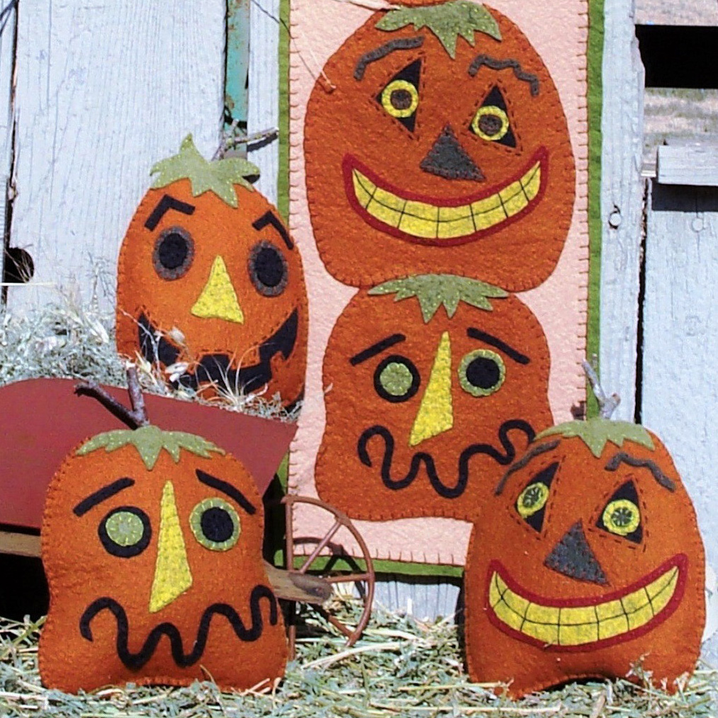 New Wool Applique friends to help you decorate and celebrate during the harvest season – Including Halloween! Make this fun skinny wall hanging or create a Trio of Wool Jack ‘O Lantern pillows. Great from late summer right through Halloween.