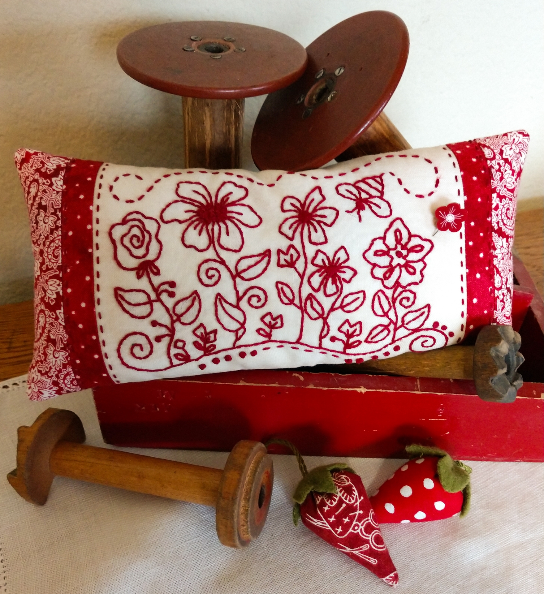 A simple garden of RedWork in easy and effective Embroidery Stitches and finished in a pair of Red & Cream Cottons.