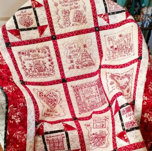 A RedWork Quilt filled with Stitchy things! Just the ticket for Embroidery lovers to have for their sewing room wall or on a favorite chair to keep off the winter’s chill while stitching something new! Add some real buttons and beads for added interest and texture on your Stitchin’ Wisdom Quilt. Just have a FUN time with this quilt!