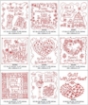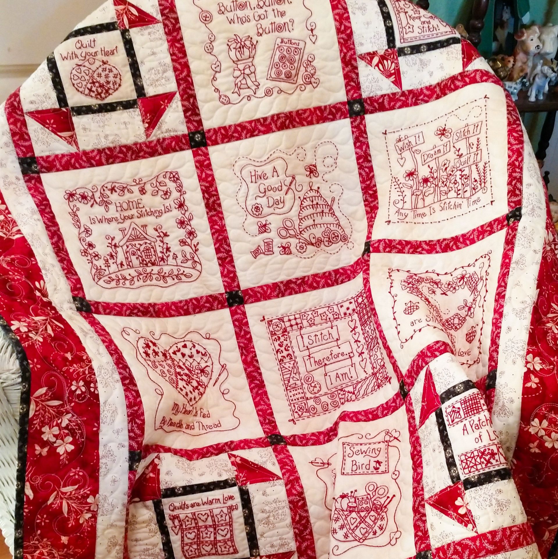 12 RedWork Quilt Blocks with whimsical "Stitchy" motifs and sayings...perfect for the Embroidery Lover