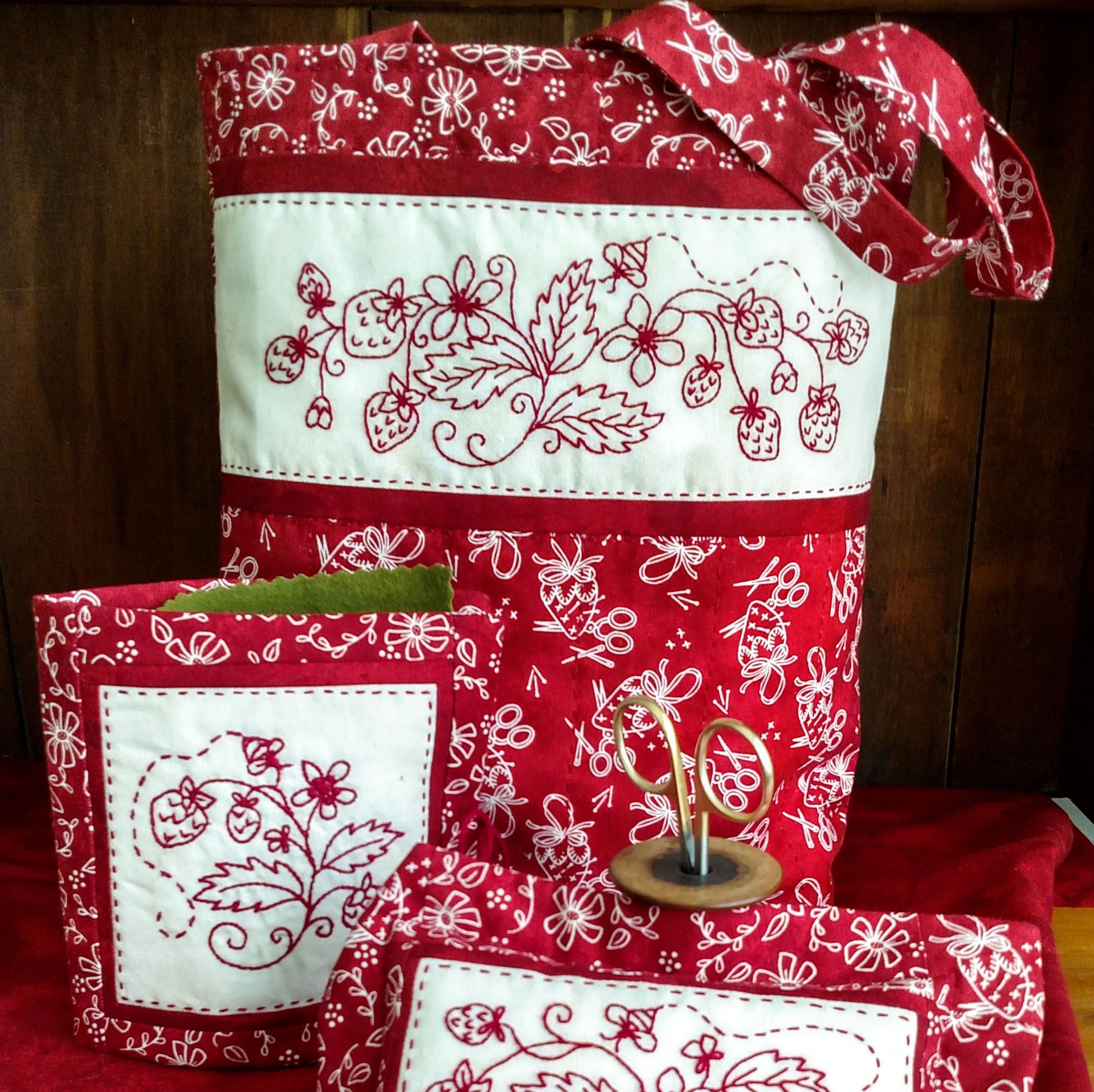 Finished Sizes: Tote = 13” x 13 3/4”, Emery Pin Cushion = 6” x 9”, NeedleCase (folded) = 6” x 6”