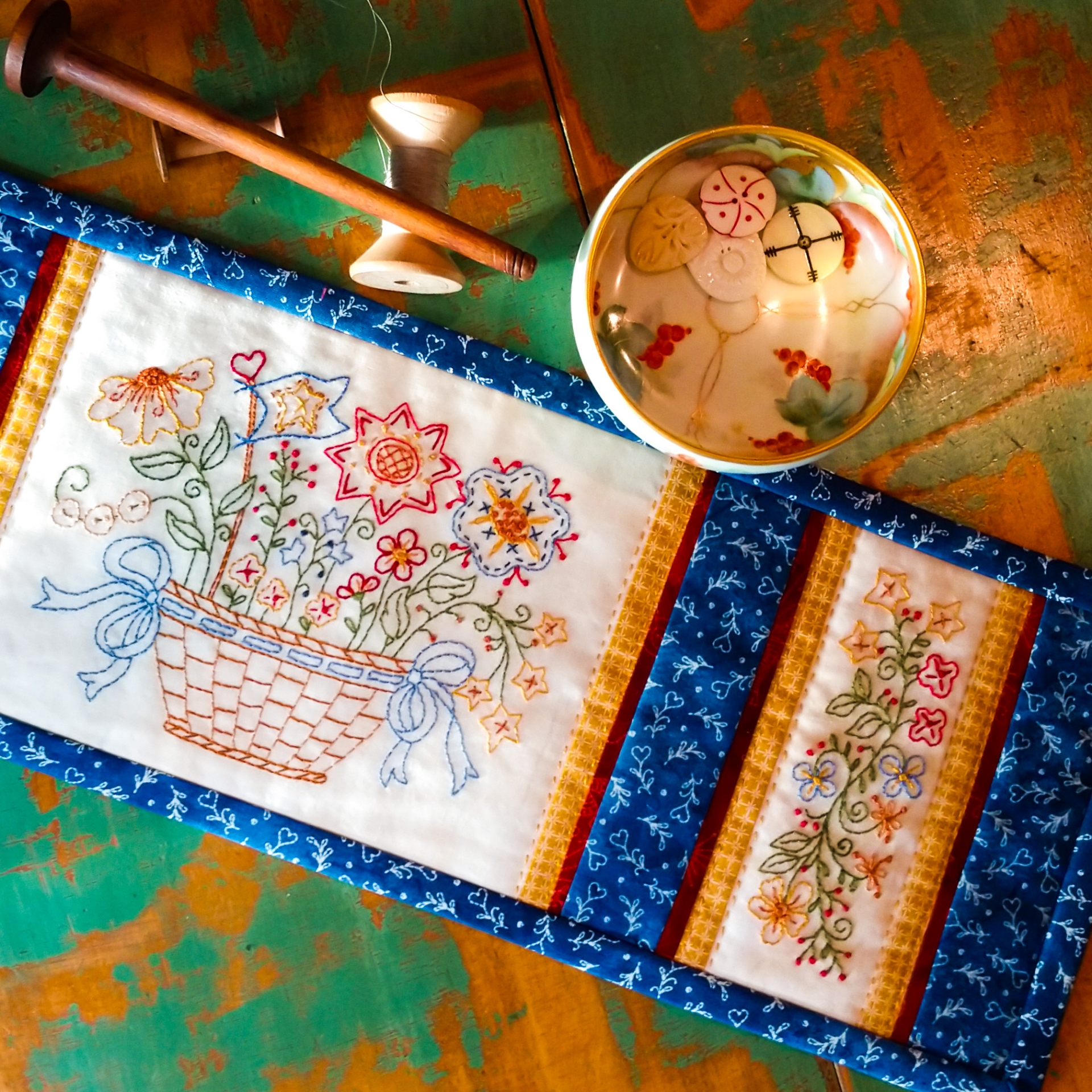 Create a Table Runner with Whimsical and Colorful Flowers embroidered with interesting Stitches filling a woven basket for a Festive Table Topper to use for any Season!Many happy complements will be given to you when you dress your table with this perky embroidery creating a “Party Flavor” in your home décor!