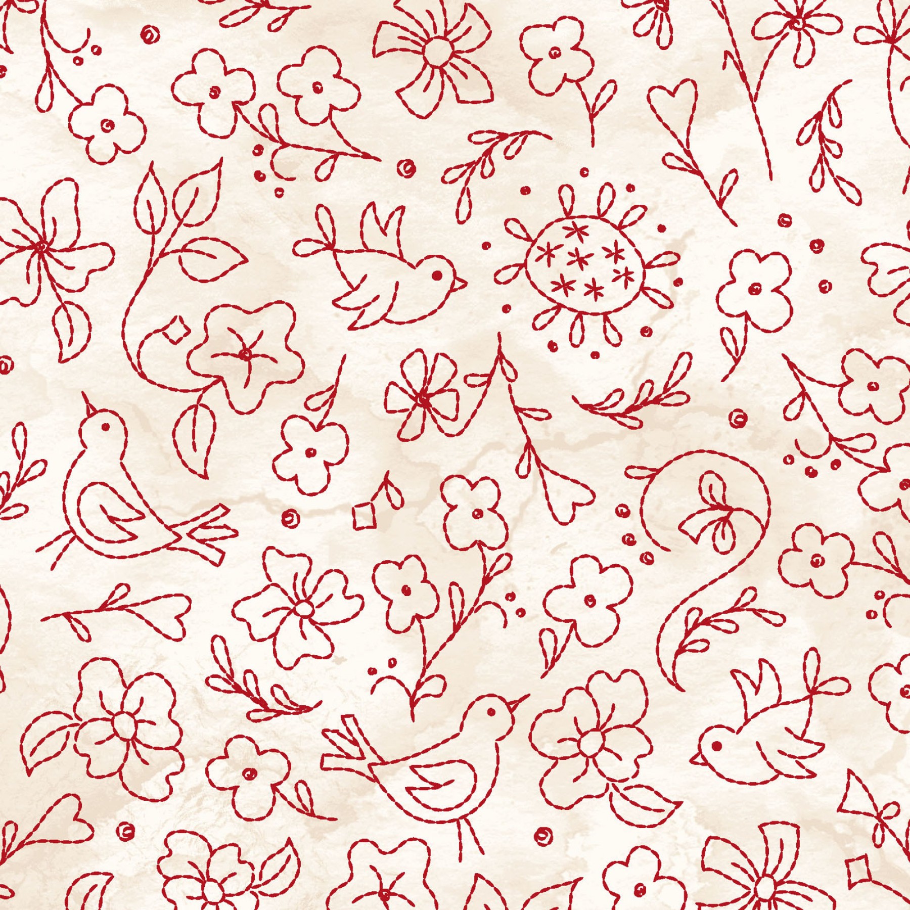 Birds and flowers with Robin's hand-drawn "Stitchy" look create a small overall print for a great Summertime fabric!