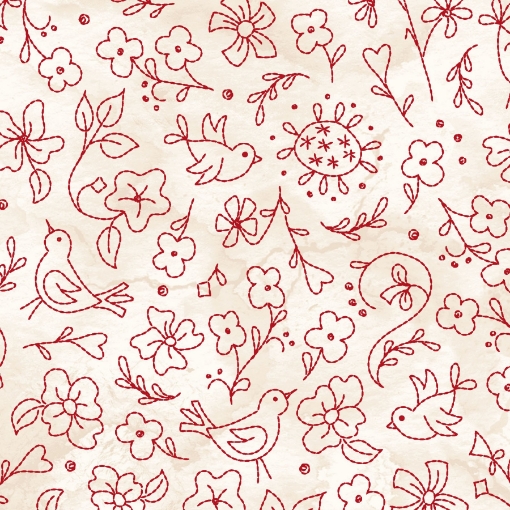 Birds and Flowers are scattered across this charming fabric printed in Red on a light tonal background.