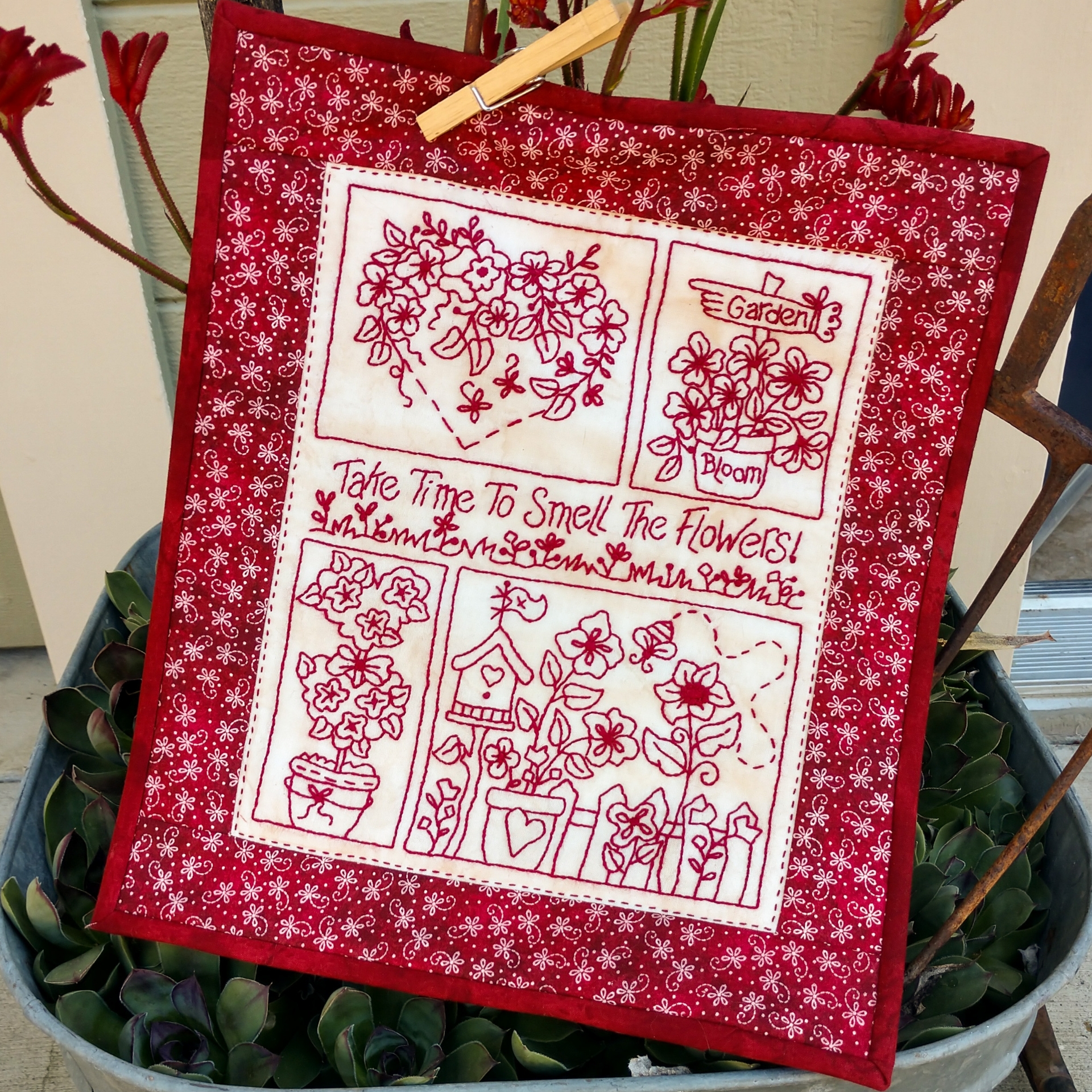 Relax and Enjoy the Flowers! A stitched Garden Motto perfect to remind you!RedWork flowers plus the embroidered motto will be a wonderful addition to your “indoor Garden”.