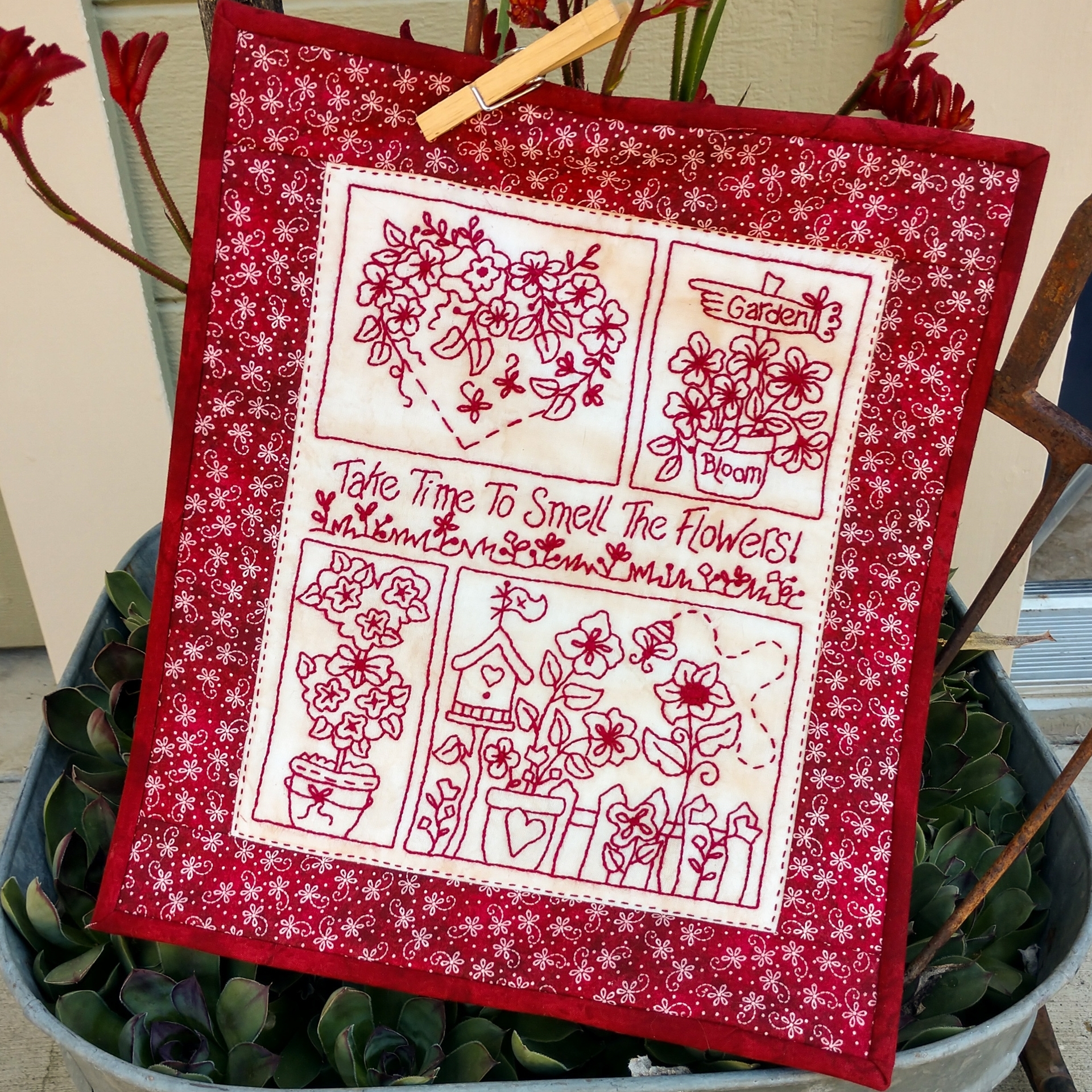 Create a Sampler of delightful Garden Motifs plus a relaxing motto we can all heed. All motifs combine to make a soothing and happy Embroidery. Hang your Sampler for all to see or use as a cheerful table topper anywhere in your Home. Each motif can be stitched and completed as a small Mini design to use as Gifts for special Family and Friends who need a smile!