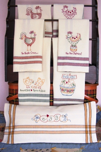 Add a flock of "Kitchen Chickens" to your kitchen with our embroidered Tea Towel designs. The sayings will add to the fun of having these useful designs in your home. They will make great hostess gifts too.Trace your designs directly onto your machine washed and dried towels with a FriXion heat removeable pen.If you DO NOT like to trace, use Stick 'n Stitch. Print the designs on the Stick 'n Stitch and pull the printed film off and finger press onto your towel. Add a hoop and get stitching in just minutes - super stuff!Stitch your towels in colors of #8 Perle cotton or pick a single coordinately color and stitch up your tea towels as RedWork. The great tea towels have a creamy background with colorful stripes and measure a generous 20" x 28". #8 Perle Cotton Colors Used: Presencia 1915 Robin RedDMC: 434 Tan, 783 Gold, 920 Rust, 931 Blue, 3346 Green.Handy Hint: thread a crewel needle with each of the 6 Perle Cotton colors to speed your embroidery. Tea Towels Used: Terra Cotta, Red, Sage Green, Gold.
