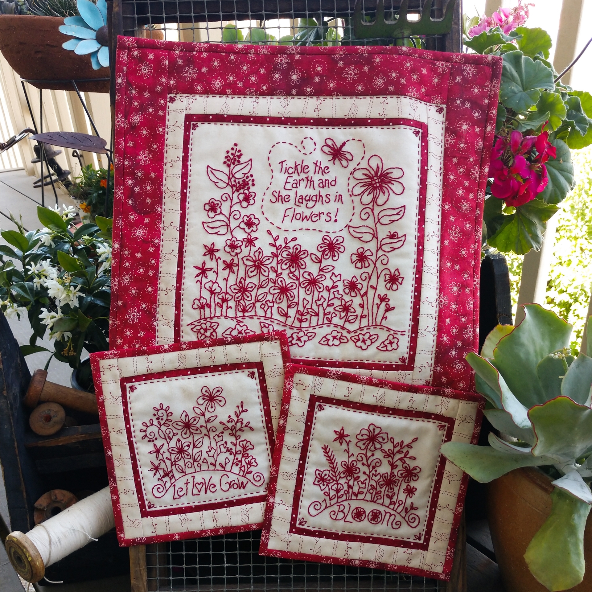 An Embroidery to please any Gardener and Flower Lover! Enjoy stitching and displaying your love of beautiful blossoms in three RedWork Table-Toppers.