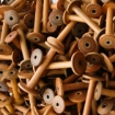 Tiny Vintage wooden bobbins once used in an interesting shuttle to weave ribbon. These little bobbins were used to hold shiny silk or rayon thread in a shuttle to weave ribbon. Very unique and cute to use in your modern-day needlework.
