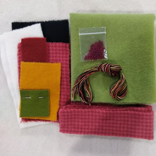 Your Materials Packet includes all the felted wool, #8 Perle Cotton, needle and red glass beads to make your Top Hat Snowman Pillow.