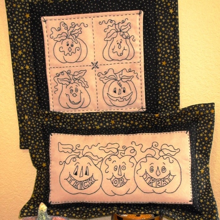Embroidered BlackWork Pumpkin perfect for Halloween. Get ready for Trick or Treat Parties and Decorate your Home with FUN Designs. Make a couple of pillows for favorite chairs or greet all those Trick or Treaters at the door with a Halloween Pumpkin wall hanging or two.