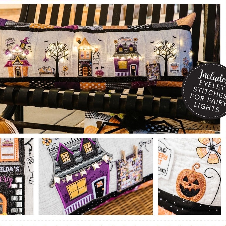 Stroll along our Twilight "Boo-levard" to visit all of your favorite “haunts!” Stop into Bella’s Boo-tique for their grand opening, then rest a spell beneath a spooky old tree. The boo-berry pie from Broomhilda’s Bakery is simply “to die for.” Enjoy a slice, then sign up for the mystery quilt at the Candy Corn Quilt Shoppe! With fairy lights, Embroidery Leather, buttons and Mylar and more, our Twilight Boo-levard Bench Pillow is so enchanting, it’s almost scary.