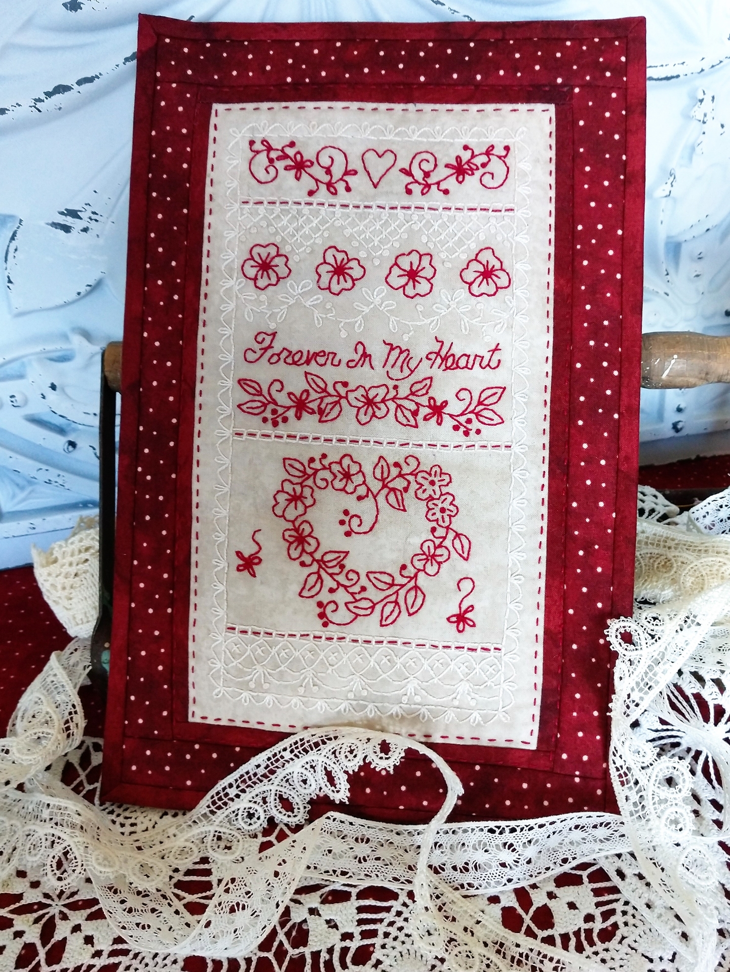 Create “Lace” with your Embroidery Stitches using creamy white thread! Simple stitches embroidered together can make such beautiful borders to accent and enhance your Valentine RedWork Design. You will be ready before February 14th with a new embroidery to celebrate this “Sweetest Day”. Stitch your Valentine Lace to display amidst any lacy doilies and pretty lace you may have in your home.