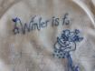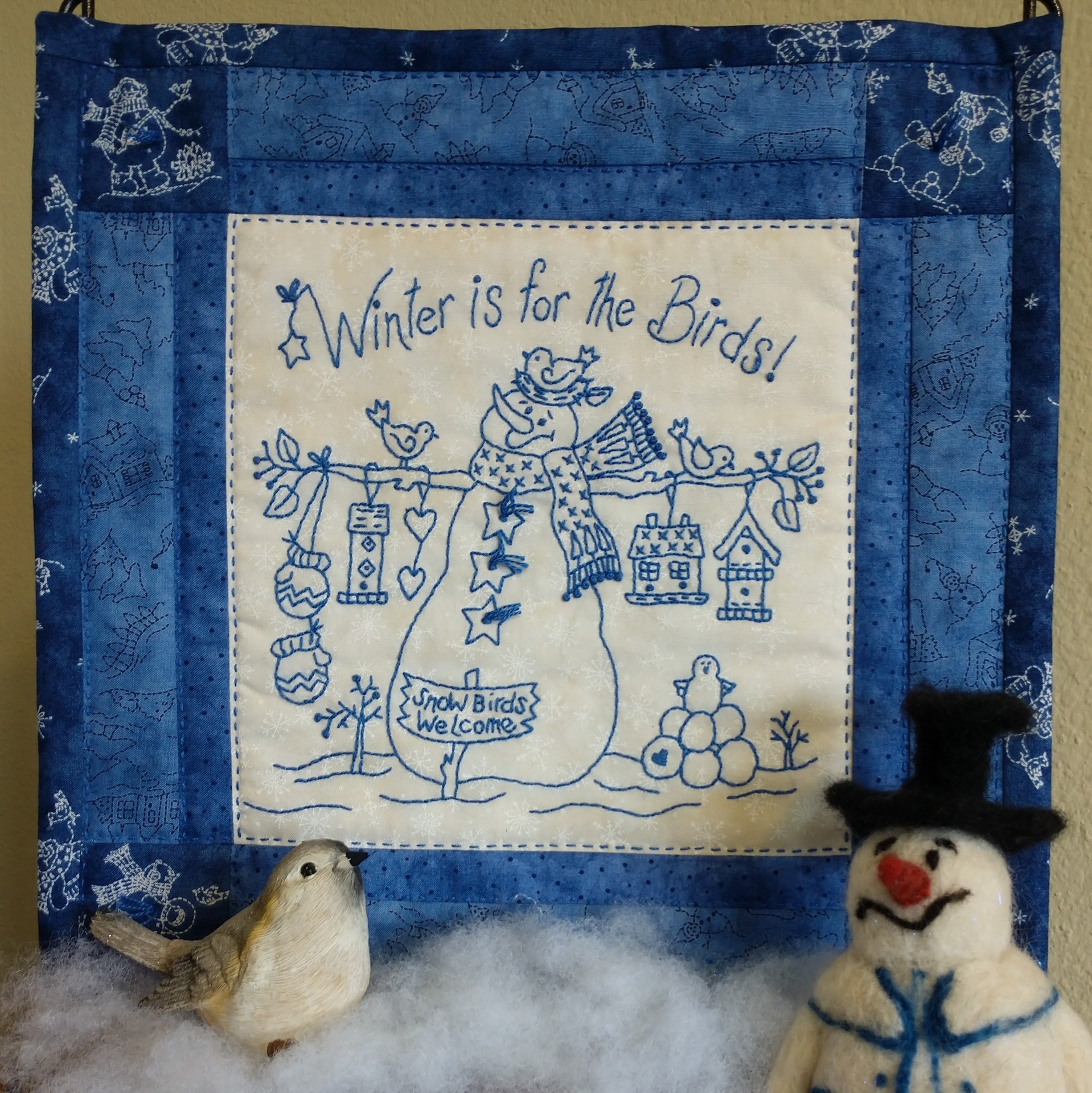 He offers his birdie friends lots of homes swinging on his generous branch arms. Create your Winter Design in chilly Bird Brain Blue Perle Cotton embroidered on a background of White Snowflakes cotton. Fun embroidery stitches plus easy “Quick Quilting” along the borders adds extra “ZIP” to your Winter Snowman. Display your amusing Snowman design on an Ackfeld Quilt Stand any place in your home!