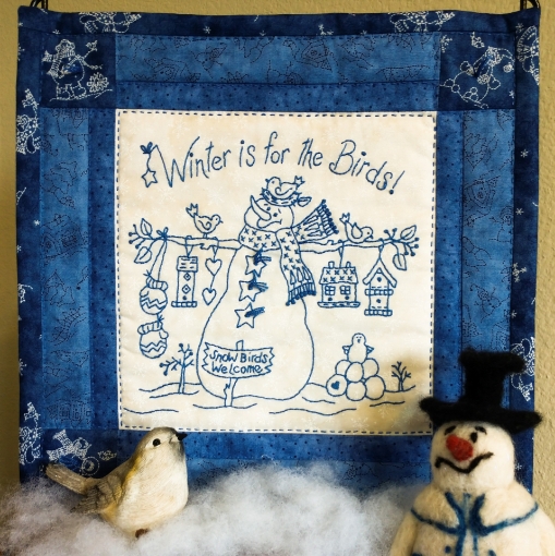 He offers his birdie friends lots of homes swinging on his generous branch arms. Create your Winter Design in chilly Bird Brain Blue Perle Cotton embroidered on a background of White Snowflakes cotton. Fun embroidery stitches plus easy “Quick Quilting” along the borders adds extra “ZIP” to your Winter Snowman