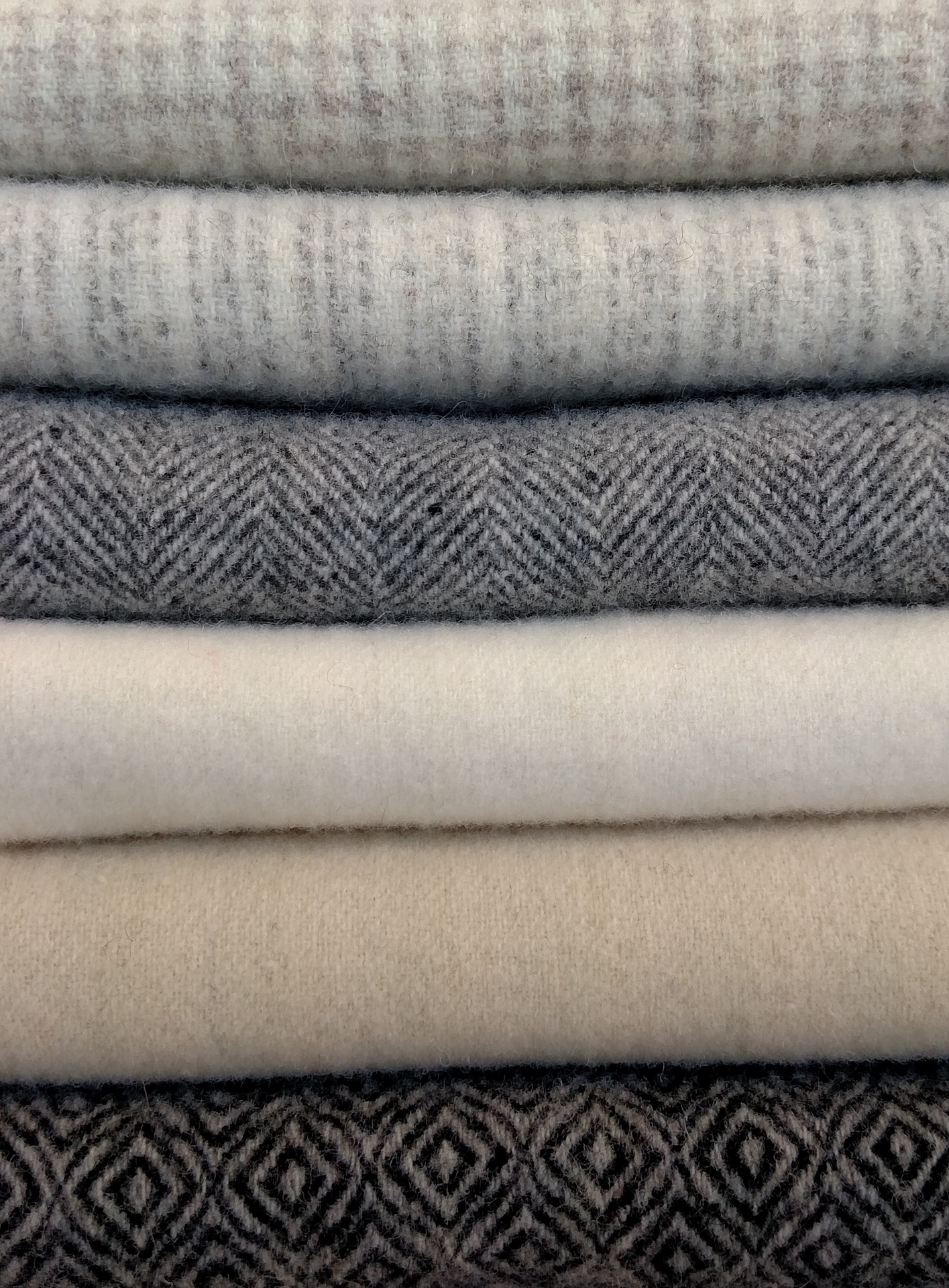 Six Neutral wool shades for Wool Applique creating terrific designs for your Winter and Snow designs. Each of the Fat 1/8th pieces (13" x 16") has been pre-felted for you and are ready to use for Applique as soon as the bundle arrives in your sewing room! Great for Rug Hooking, too.