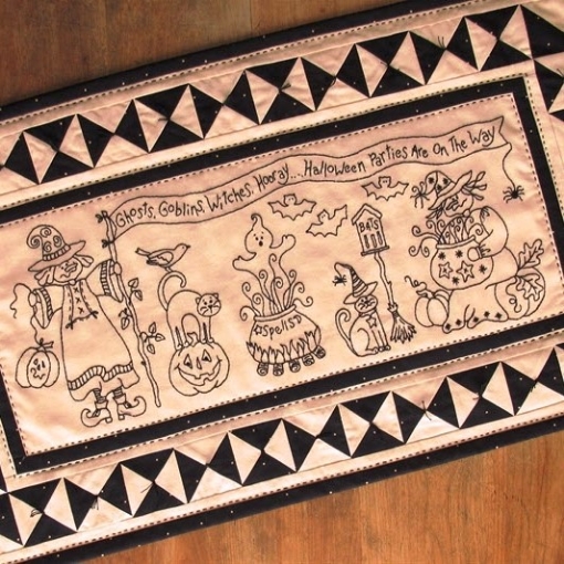 Embroidered center measures 8" x 20" and finished table runner is 16" x 28".