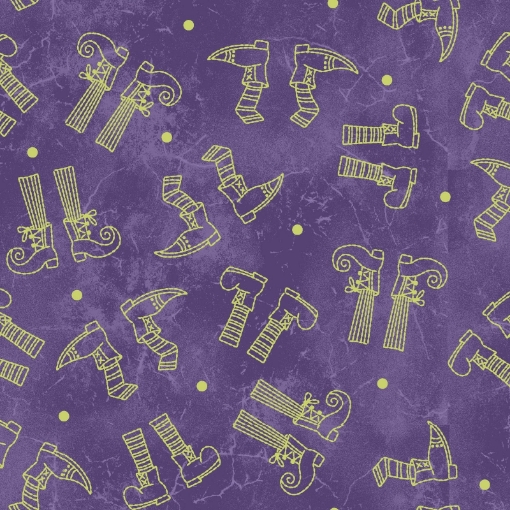 A variety of pairs of Green Witch's Legs and Shoes are scattered on a tonal Purple background....So Great to Add to the Completion of Your Embroidery or Quilts in combination with other Halloweenie coordinates!