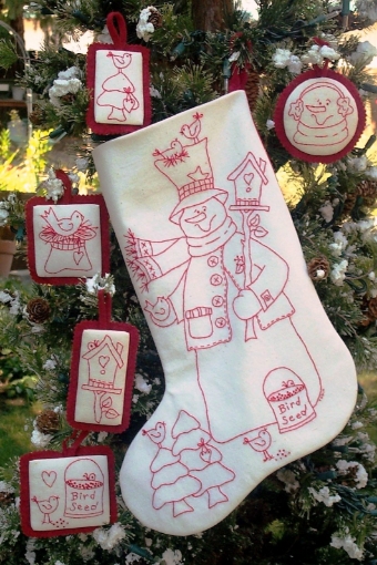Mr. Snowman and his woodland feathered friends are FUN to stitch in RedWork and will happily decorate any holiday home. The coordinating ornaments will feel at home snuggling on your tree or decorating a rustic twig wreath.