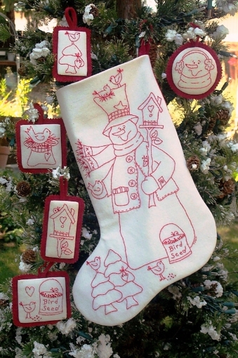 Mr. Snowman and his woodland feathered friends are fun to stitch in RedWork and will decorate any holiday home. The Stocking and the coordinating ornaments will feel at home snuggling on your tree or decorating a rustic twig wreath. Trace your design illustration to your muslin with the Heat Removable FriXion Pen.If you DO NOT like tracing, try Stick 'n Stitch. Print the design on 2 sheets of 8 1/2" x 11" Stick 'n Stitch. Put one sheet on your muslin and complete stitching and then add the second sheet and finish your stocking. Print the 5 ornaments on a single sheet of Stick 'n Stitch.